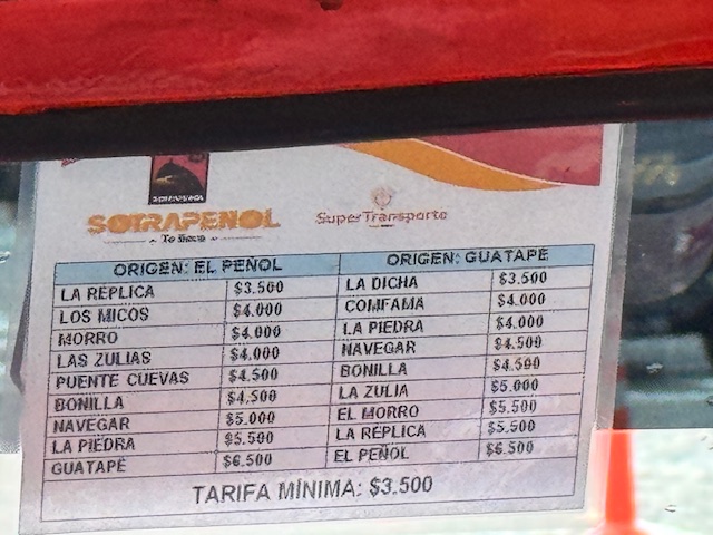 Tuk-tuk between Guatapé and La Piedra – 25,000 COP (6.75 USD) to the base, 20,000 COP (5.5 USD) at the highway (same drop off as the Jeepneys) for the tuk-tuk (the road to the base is steep and some tuk-tuks struggle to get up there with just two passengers)