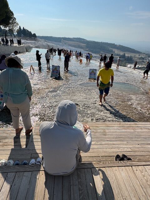 There are several white travertine terraces filled on the hill’s southern slope. But most of the terraces are dry or off limits to visitors. There were only about a dozen or so terraces that had water where people can wade in.