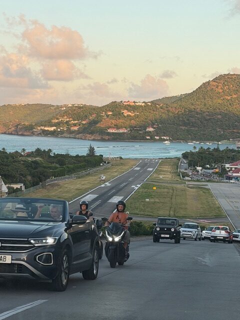 St. Barth’s short airport runaway in the background with St. Jean Beach at the end