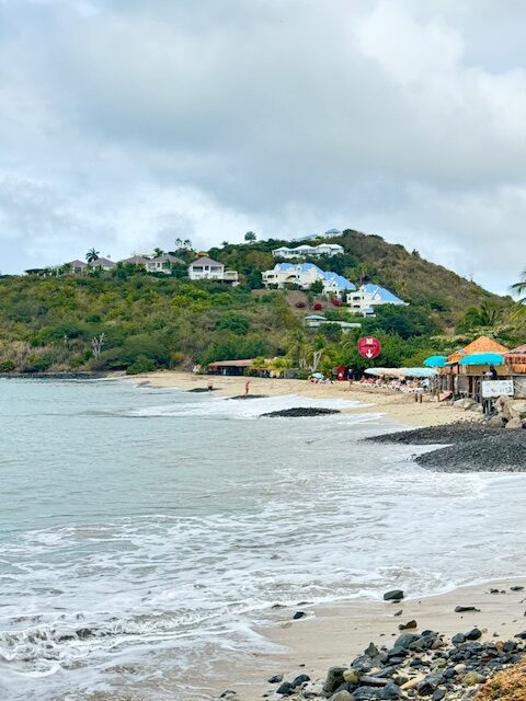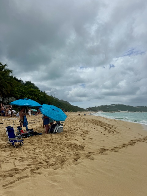 Baie Rouge is on the French side at the island’s western end. The beach is tucked away without any sign or direction. There are no bars or restaurants so you have to bring whatever you need. The waves were big during our visit. It has a small dirt and rutted parking lot, probably enough for a couple of dozen cars. Our small rental car made it through but we had to go really slow and carefully pick our path.