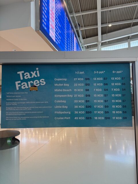 Taxi: Fares are set based on the number of people, distance and how the driver figures it in his or her head. There are no meters, only guidelines as shown in the photo. Three times we rode taxis between Marigot and Princess Juliana Airport and the cost was always $25 for two people. The cost per person drops to $10 per person if there are 3 to 5 people riding according to our taxi driver. We also overheard the conversation between three tourists and a taxi driver. The taxi driver charged the three people $10 per person for a ride from Philipsburg Front Street to Marigot Port which is considerably further than from the airport to Marigot.